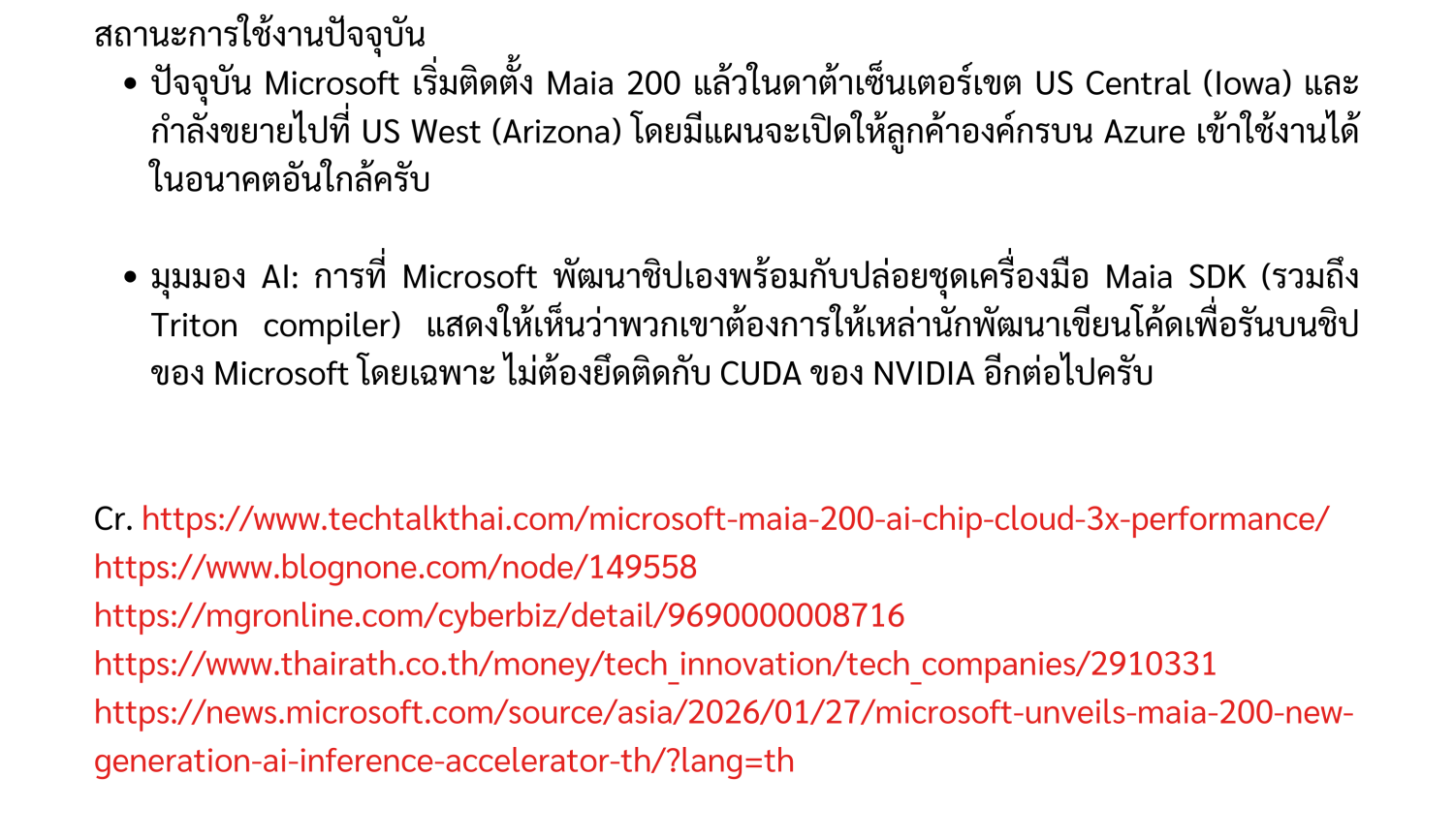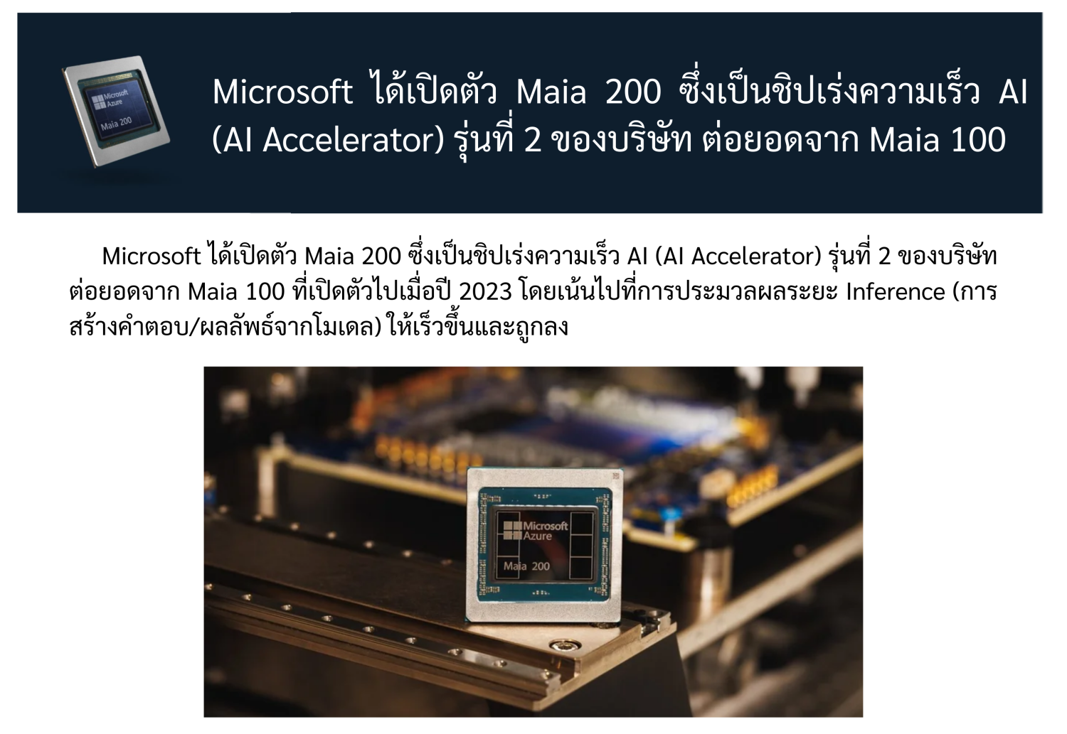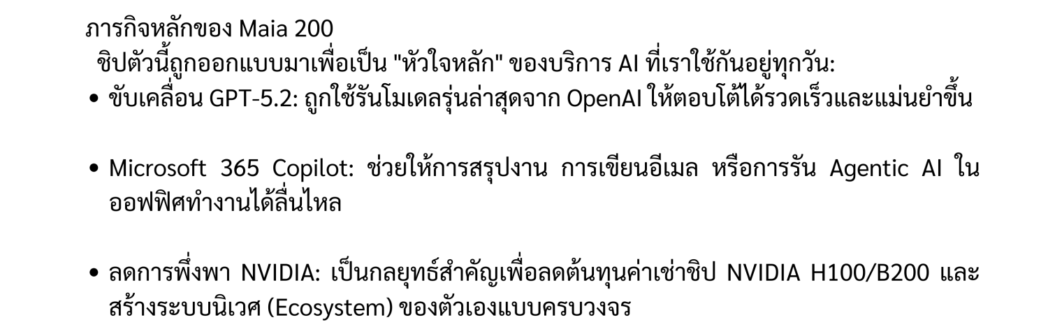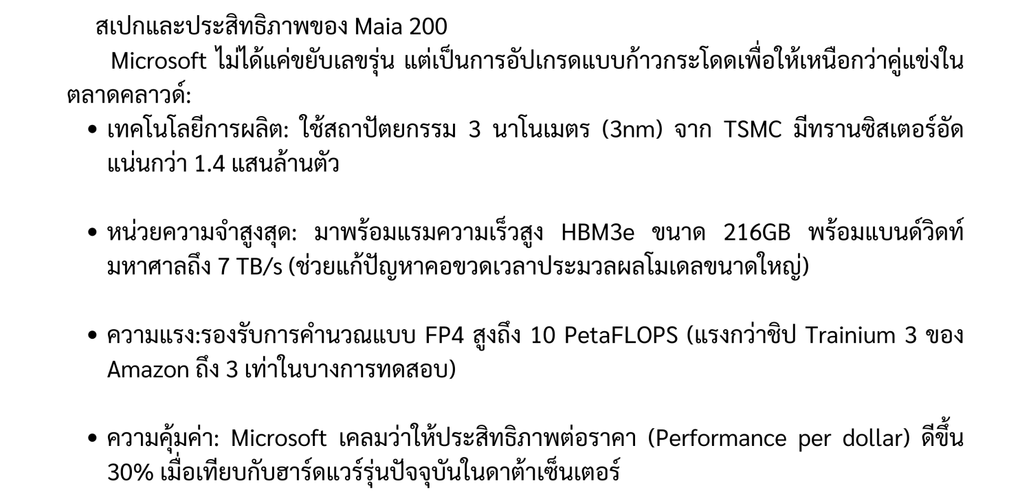 Microsoft ได้เปิดตัว Maia 200 ซึ่งเป็นชิปเร่งความเร็ว AI (AI Accelerator) รุ่นที่ 2 ของบริษัท ต่อยอดจาก Maia 100
