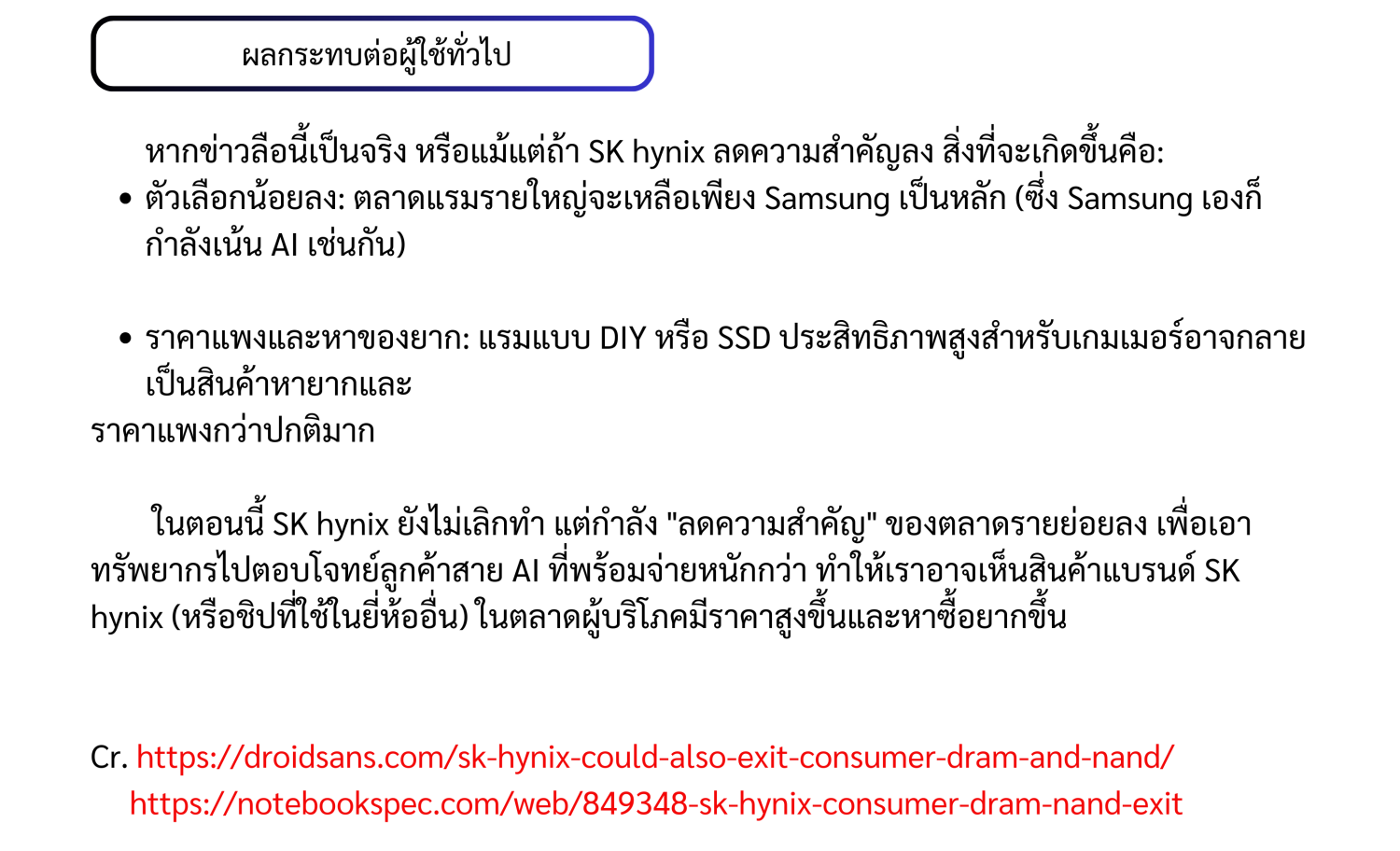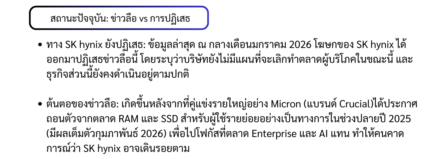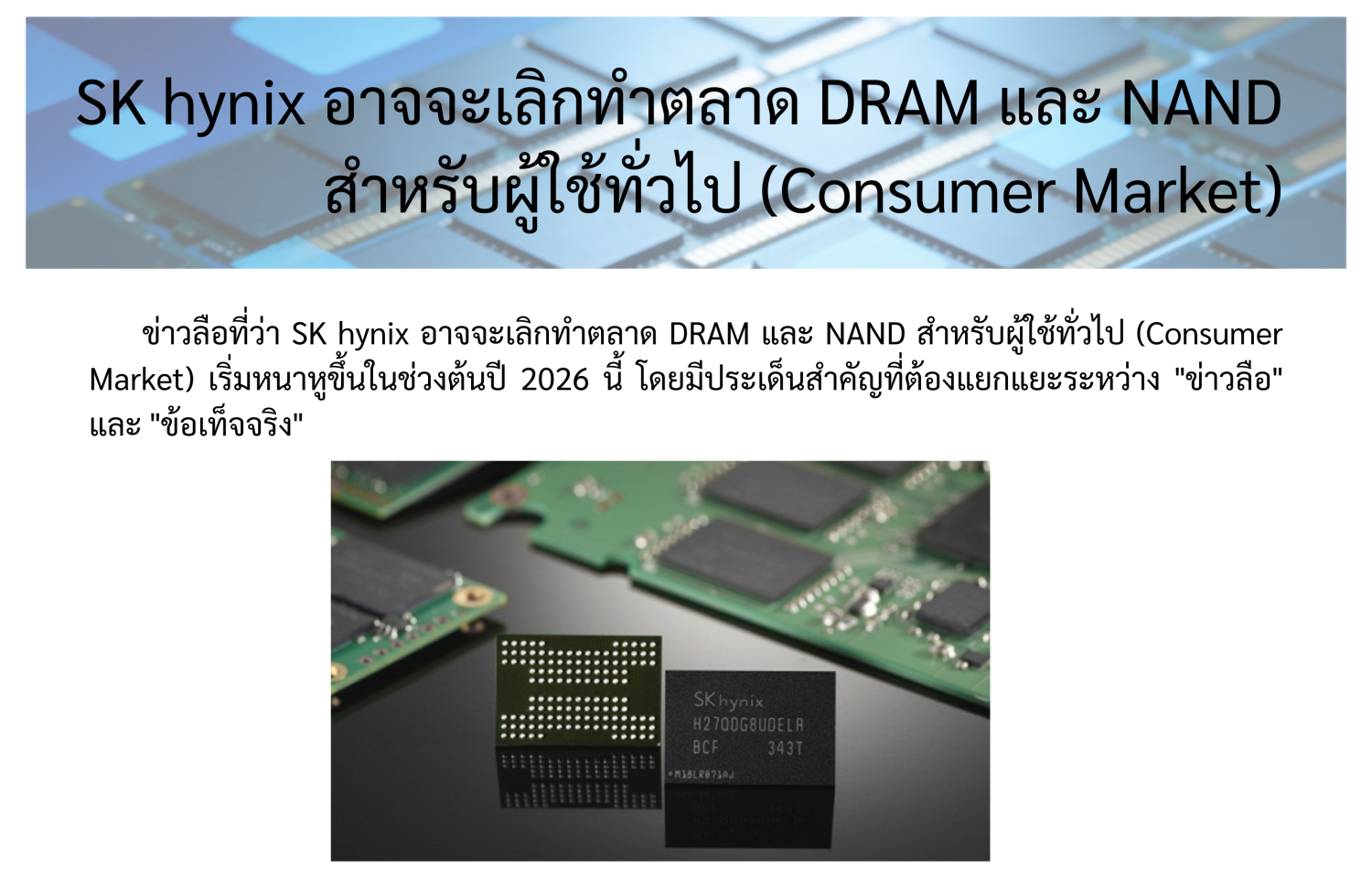 SK hynix อาจจะเลิกทำตลาด DRAM และ NAND สำหรับผู้ใช้ทั่วไป (Consumer Market) SK hynix อาจจะเลิกทำตลาด DRAM และ NAND สำหรับผู้ใช้ทั่วไป (Consumer Market)